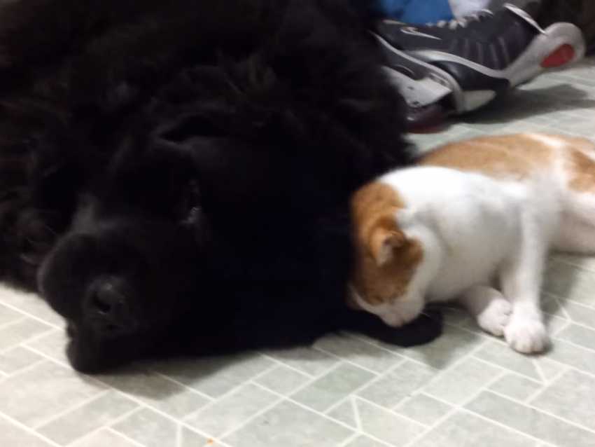 Une vidéo remplie de tendresse! Un Terre Neuve et un chat se tiennent côte à côte pendant la sieste. Bien que le chien soit d'une taille importante, cela n'empêche en aucun cas au chat d'avoir peur. Au contraire, il le câline et se frotte contre lui, ce qui n'a pas l'air de déplaire au Terre Neuve.