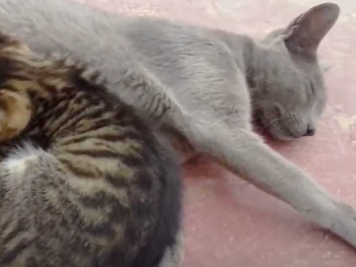 En tout cas, le troisième (un Bleu Russe) se réveille et observe alors les deux autres, mais semble veiller à ne pas bouger afin de ne pas les réveiller.