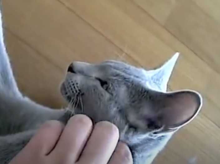 Cette vidéo montre un chat Bleu Russe allongé sur le sol et qui se fait câliner par son maitre. Il semble apprécier ce moment de complicité et de tendresse, car il patoune dans l'air et ferme les yeux au fil des caresses.
