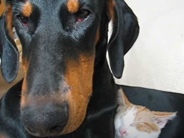 La cohabitation entre chats et chiens se passe généralement bien quand les individus s'habituent l'un à l'autre très tôt dans leur vie, même si cela ne se déroule pas toujours sans heurt. Cette vidéo montre un Dobermann en train de somnoler contre un chat Européen qui, quant à lui, dort paisiblement. Les deux compères semblent être de vrais copains !