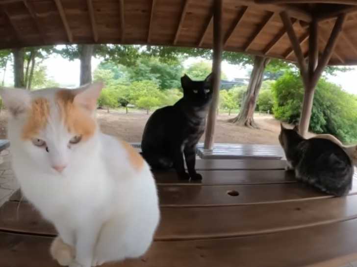 Cette vidéo tournée au Japon montre un chat qui se fait approcher et caresser par la personne qui filme. Le chat semble être en confiance, et miaule pour attirer l'attention. Il invite ensuite la personne à aller voir ses autres amis chats qui se prélassent dehors sur des bancs et des tables. Cette séquence insolite montre la capacité des chats à communiquer entre eux et avec les êtres humains.