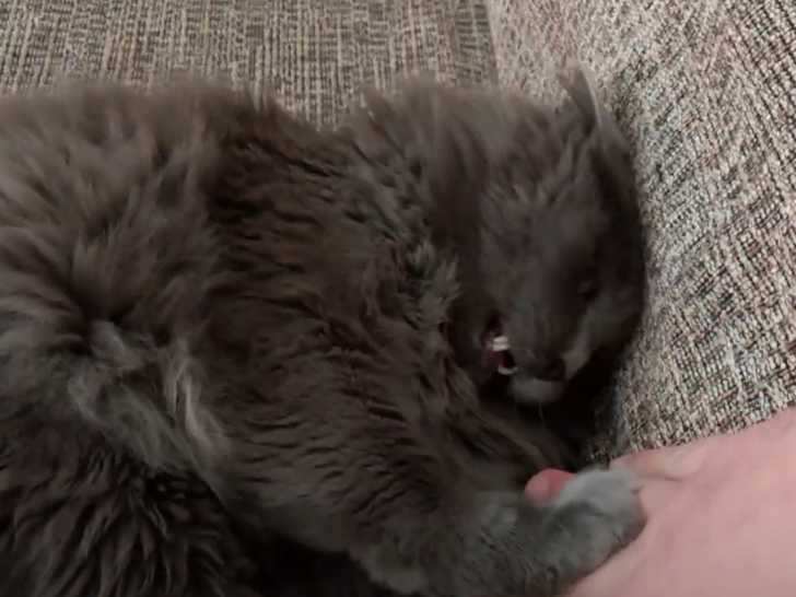 Cette vidéo montre un chat de race Nebelung qui est allongé sur le canapé pour obtenir des caresses de la part de son propriétaire. En effet, dans cette vidéo, le félin fait les yeux doux à son maitre pour se faire câliner.
