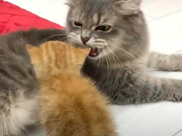 Cette vidéo montre un chaton roux qui rencontre une maman chat pour la première fois. Le petit félin tourne autour de la chatte grise qui semble au premier abord le rejeter. Une première rencontre qui se déroule sous une inquiétude pesante des deux félins !