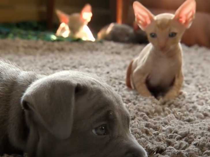 Cette vidéo montre une fratrie de chatons de race Cornish Rex en plein moment de complicité avec un chien de race Pitbull. Au début de la vidéo, les petits félins s'amusent comme des petits fous entre eux. Ensuite, un des chatons essaie de jouer avec le chiot. La cohabitation entre le chaton et le chien semble se dérouler à merveille.