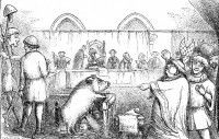 C’est ainsi qu’on apprend par exemple qu’un cochon du village de Falaise fut, en 1386, condamné à mort pour avoir mordu mortellement un enfant au visage. Habillé en homme, le cochon fut alors exécuté devant les habitants du village et devant les autres cochons que le juge encouragea à amener afin qu’ils puissent voir ce qui les attendait s’ils commettaient des crimes.